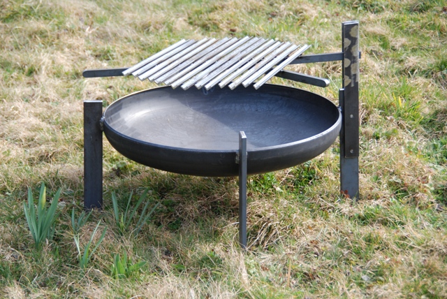 Der Grillrost kann in 3 Positionen über dem Feuer angebracht werden. Die Winkeleisen leiten einen Großteil des Bratfetts an den Rand der Schale.