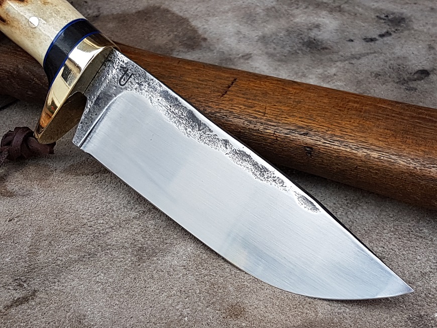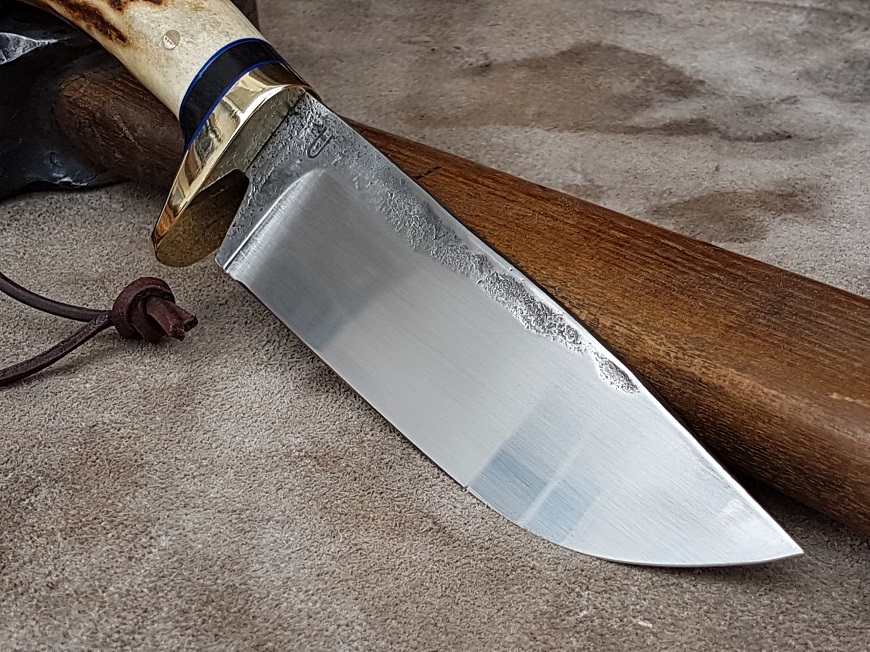 Die Klinge ist geschmiedet aus C105, 140mm lang und 4mm stark. Sie wurde differenziell gehärtet. Leider ist die Härtelinie nicht so gut sichtbar.