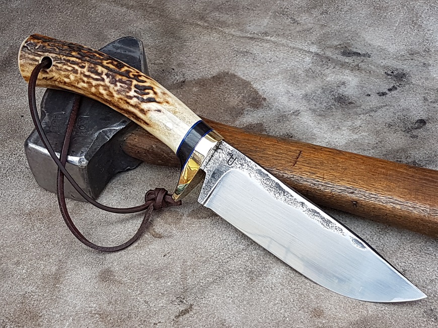 Der Griff ist 135mm lang aus Sambarhirsch, Messing und Ebenholz mit blauem Vulkanfiber und einem Messingpin.