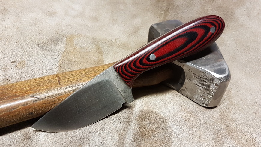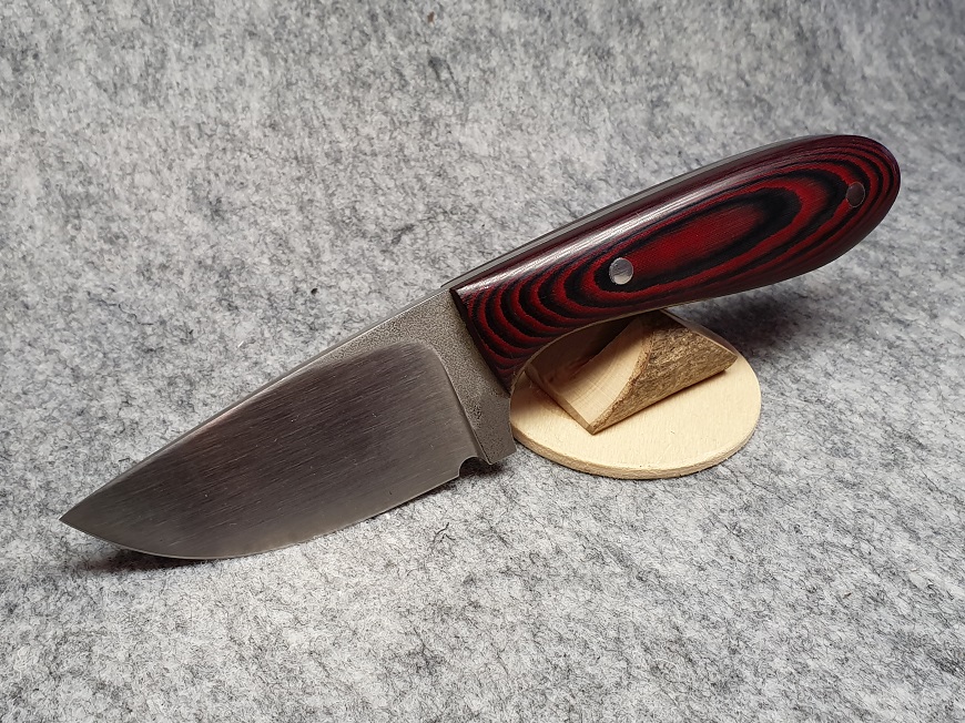 Die 80mm lange und 3mm dicke Klinge ist aus SB1 und von Stefan Steigerwald auf 61HRC gehärtet. Der Griff ist 105 cm lang, mit Schalen aus Mikarta in Edelstahlpins.